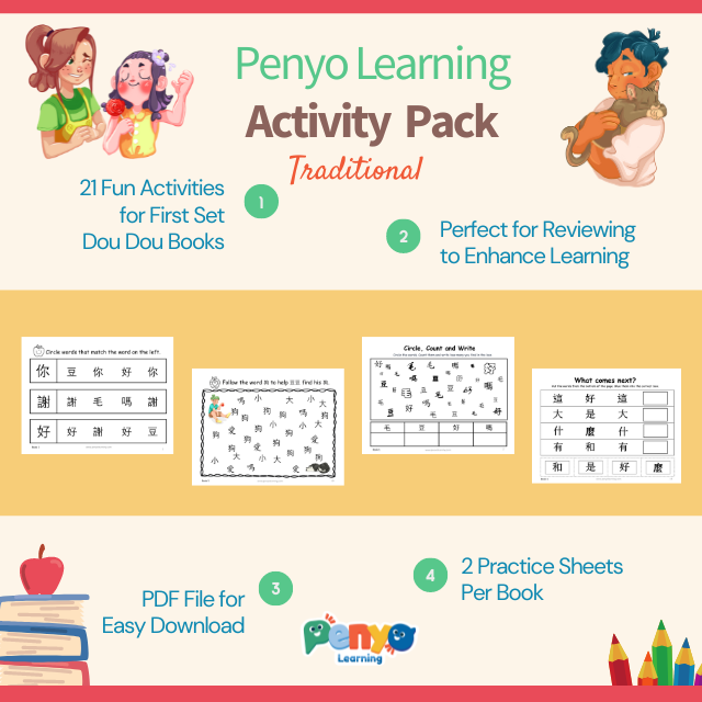 This MUST-HAVE Activity Pack has 21 pages of fun worksheet activities that your child can do while reading our books. It can be used during or after reading each book, as well as for review. There are two worksheet activities per book, including drawing, making graphs, cutting and pasting, playing games, and much more. Your child will enjoy completing these worksheets without realizing they are actually learning one of the most complex languages in the world.