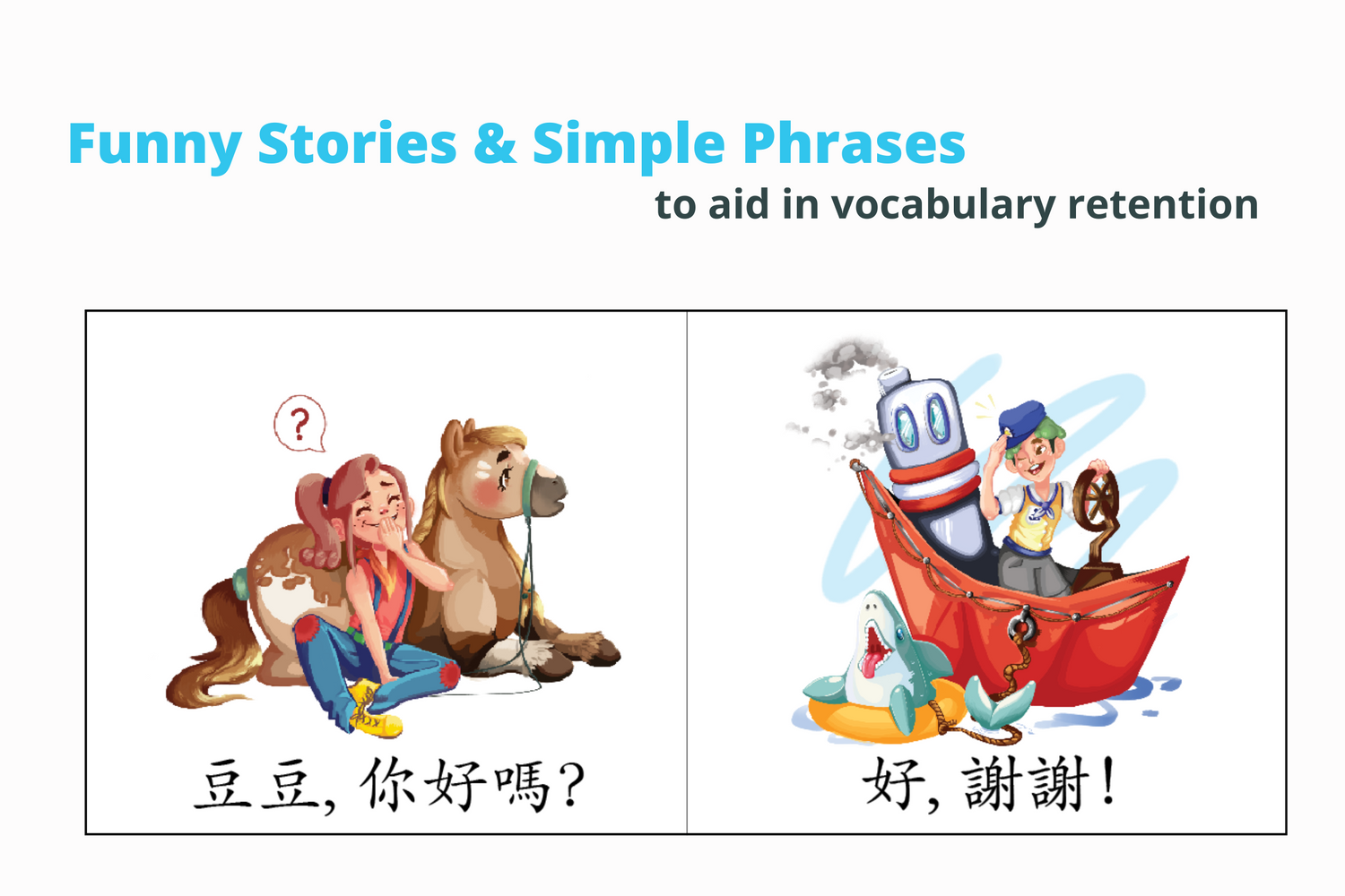 Fun stories with simple phrases to aid in vocabulary retention
